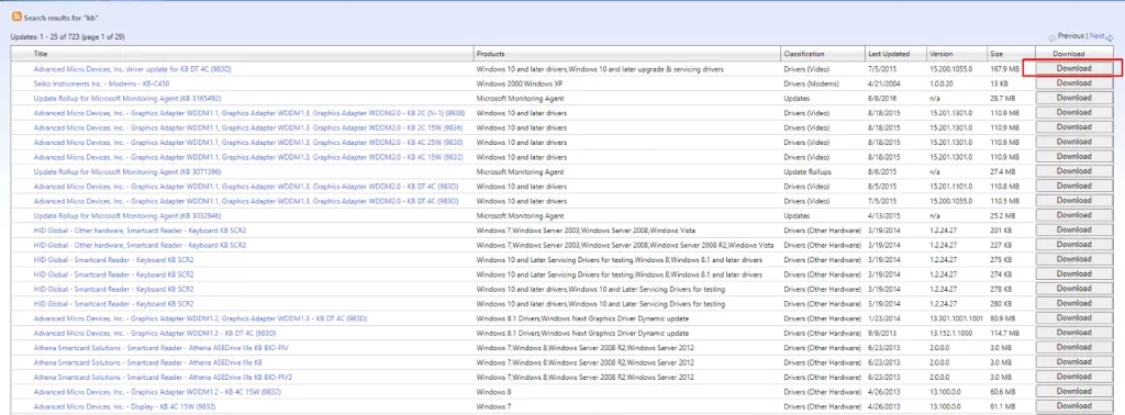 - Encontrar a atualização que corresponde ao seu sistema e clique em Download.